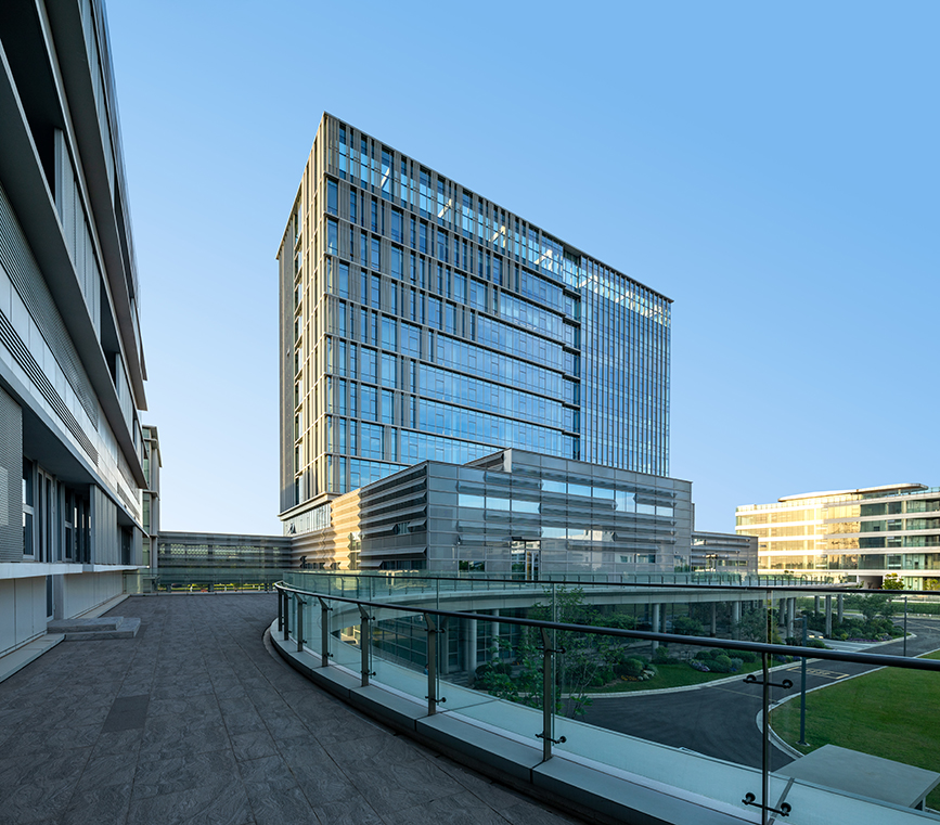 项目为两栋高层的建筑形式,结合生产的需求以及工业建筑参观流线的需求。方案设计以城市界面和肌理作为切入点,严格按照建设项目规划条件及城市设计要求,将塔楼布于地块西南角和东北角,这样为场地东南角预留出一个大的宽敞公共广场,完美的融入到城市界面中去,更加直接的展示沛嘉医疗的自身的形象。同时,通过外围廊的联系,使两座高层形成一个整体。各栋建筑用弧形的飞桥相联系。景观飞桥将建筑单体结合成统一整体。形成立体的交通景观系统。地面,空中的景观延伸进入室内,展现独具特色的总部园区。